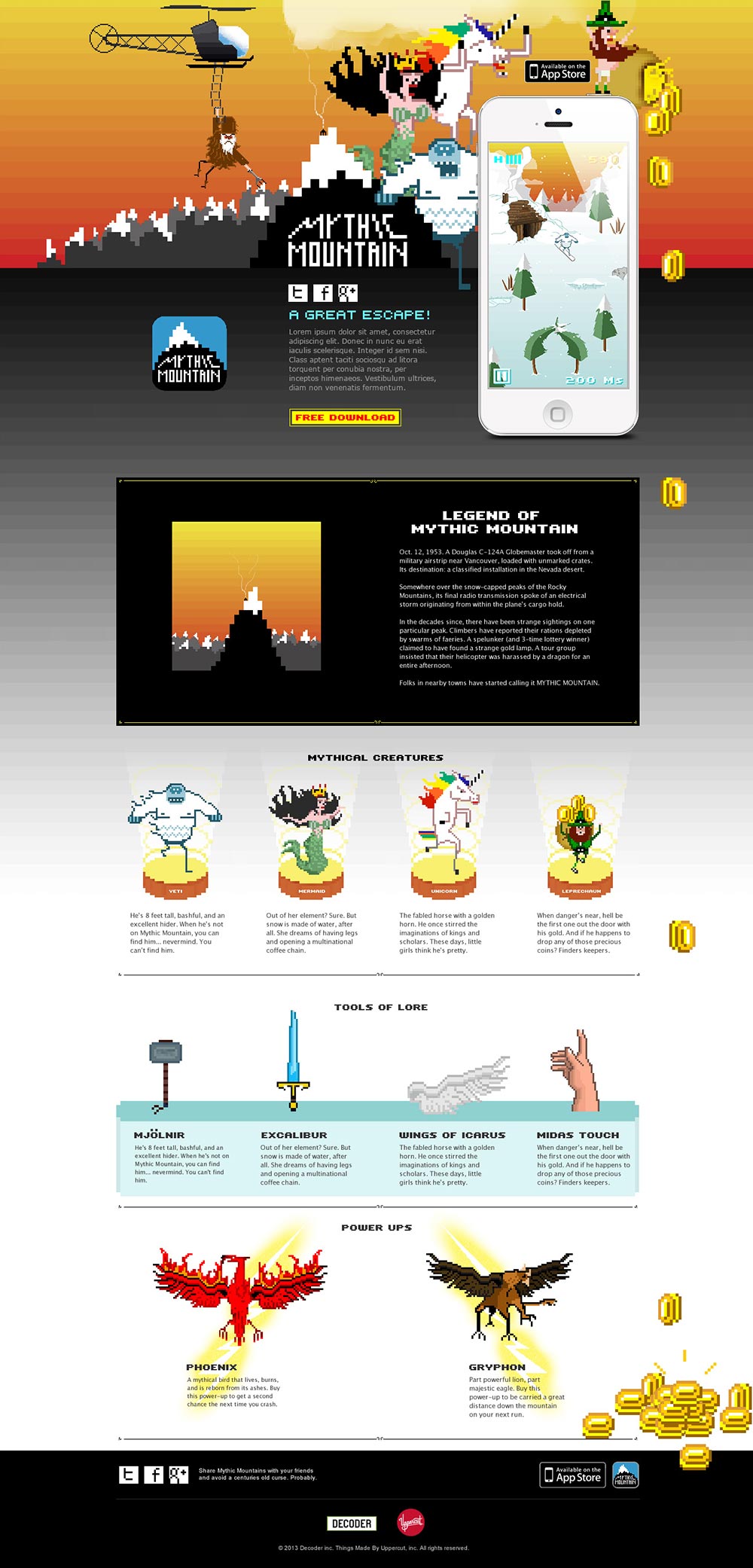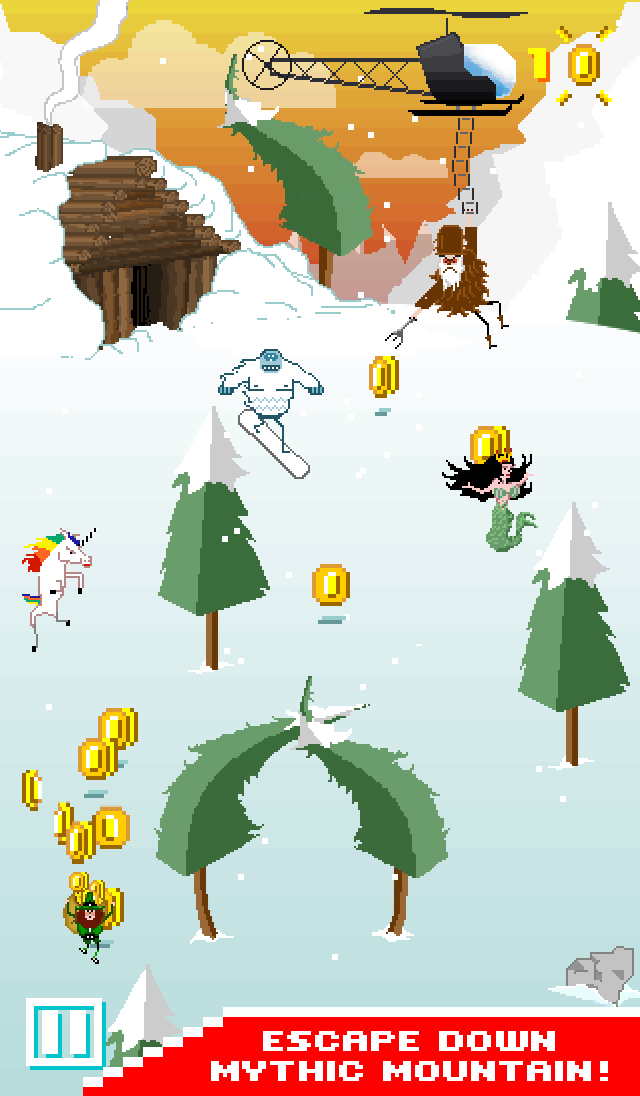 Escape from Mythic Mountain! In the vain of an infinite runner game - make your way down the mountain as you try to collect as much leprechaun gold as you can before being caught by the crazy cryptozoologist.