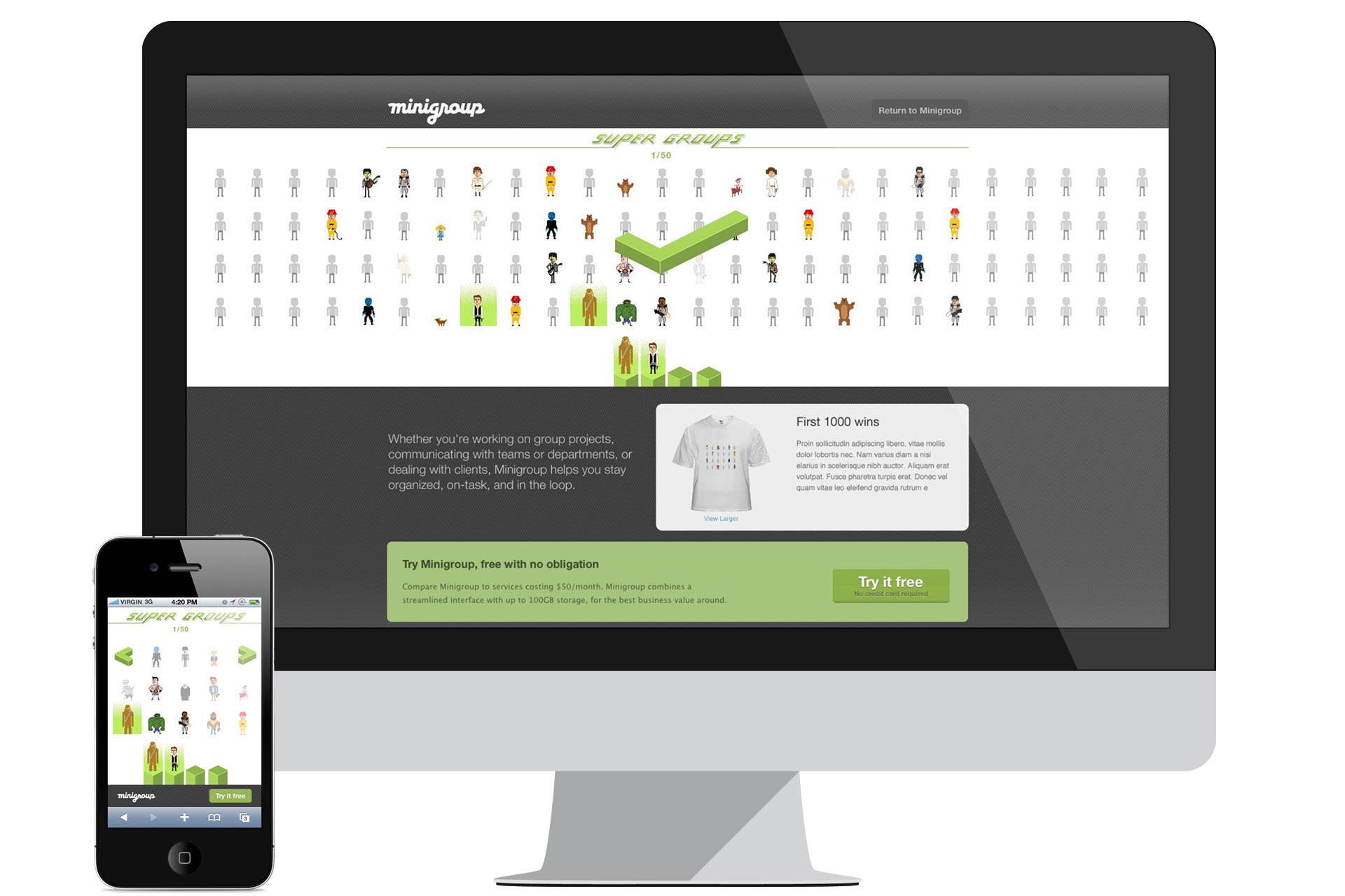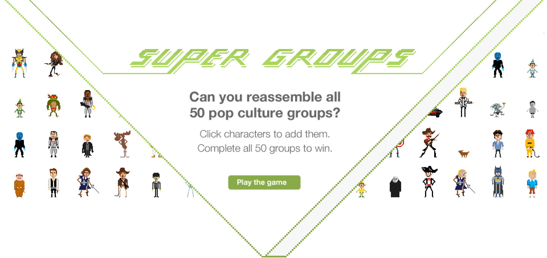 Minigroup - a start-up based in the secure community collaboration space approached us for some shareable marketing to engage their users. Myself and Anders came up with a great little puzzle game based on how many pop culture groups you could bring together in a puzzle of pixelated characters. As you found matches you could post to social media and engage others to see how many they could solve. Can you reassemble all 50 pop culture groups?